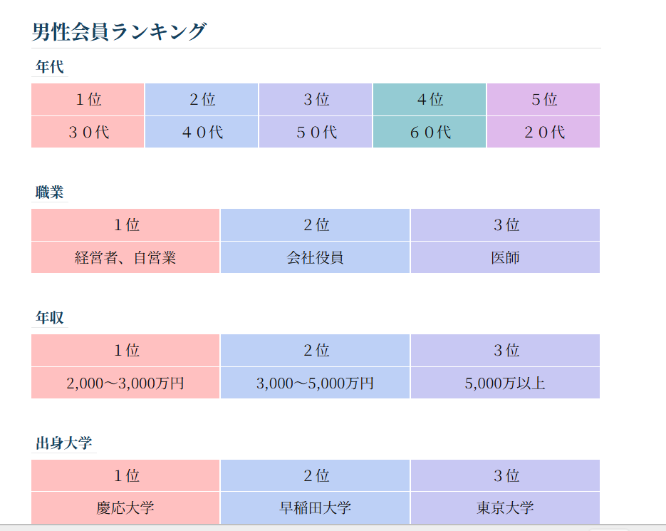 男性会員の職業IT・不動産・金融系経営者・弁護士・医師