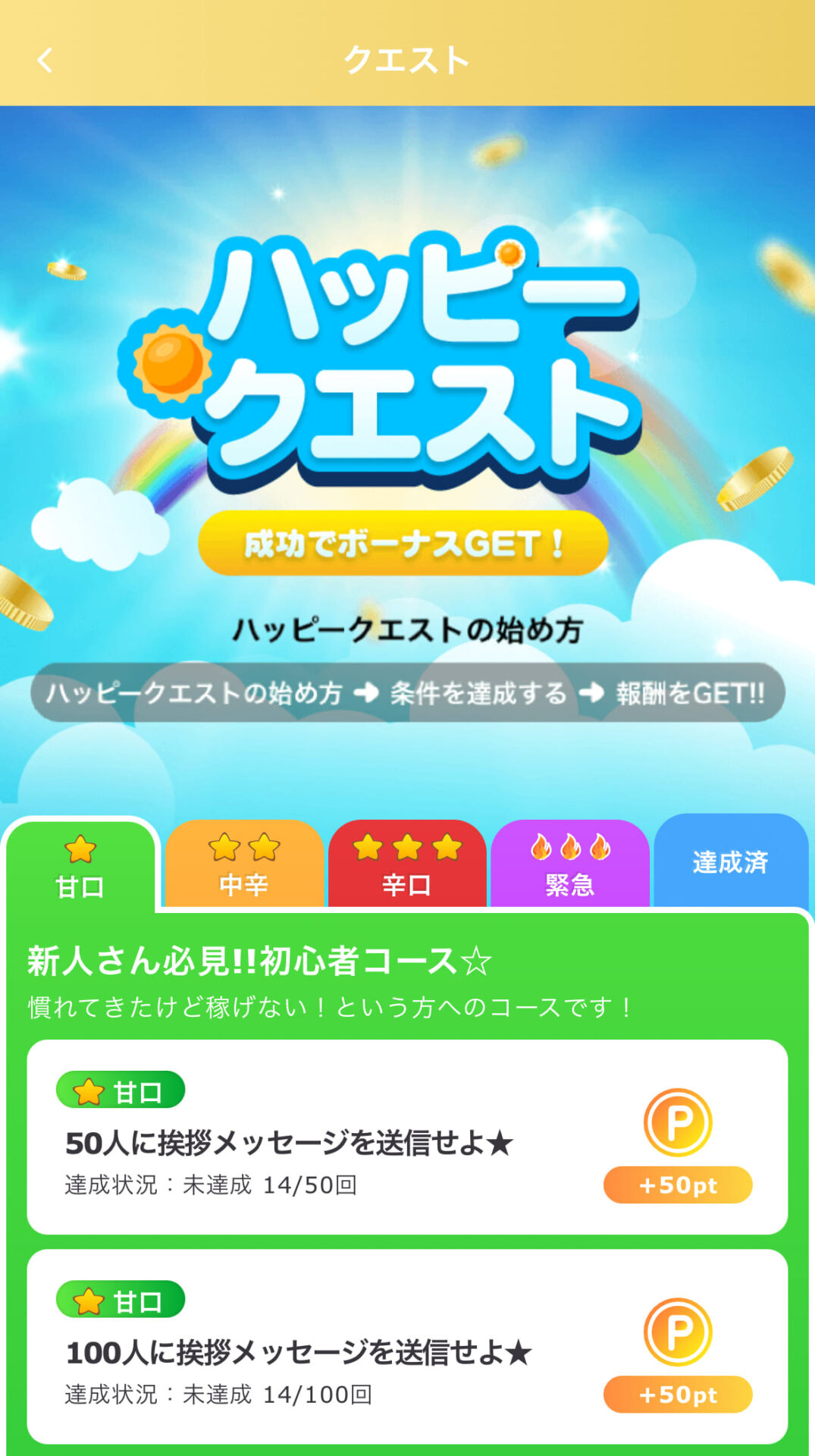 チャリンには「ハッピークエスト」と呼ばれるミッションイベントが常時開催されており、甘口〜緊急まで4つのレベルに分かれています。