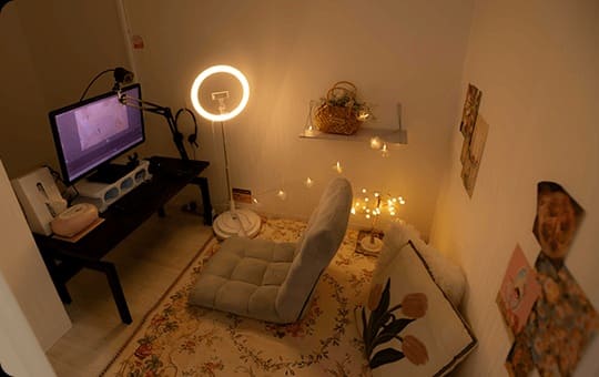 柔らかな照明と温かみのあるインテリアで統一されたチャットルームは、リラックスして配信に集中できる空間です。照明・カメラ・マイクなどの設備はすべて完備され、操作も簡単。