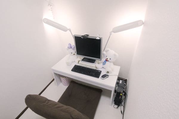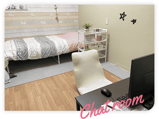 チャットルームは、明るく清潔感のある完全個室。白を基調とした落ち着いた空間で、防音もしっかりしているため周囲を気にせず安心してお仕事ができます。