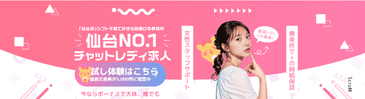 | チャットラボ仙台 | 3,000~6,000円 | JR仙台駅東口より徒歩5分 | 可能 | タクシー代・駐車料金一部負担制度あり | ・月間ボーナス ・シフトボーナス ・新人ボーナス ・友達紹介ボーナス ・教育テスト審査ボーナス ・季節に合わせたキャンペーン |