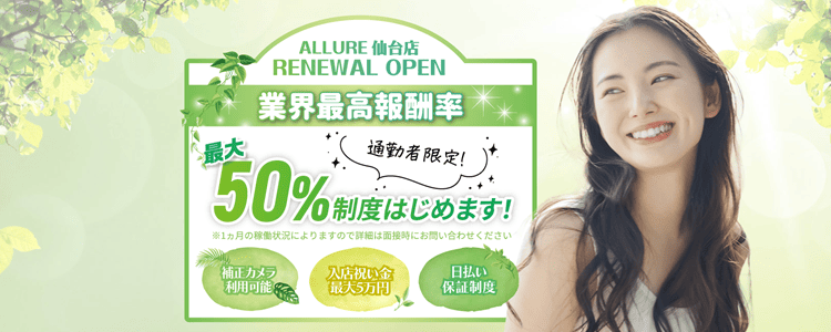 | アリュール仙台店 | 2,500円~5,000円 | 仙台駅東口から徒歩5分以内 | 可能 | 非公開 | 入店祝金最大3万円 |