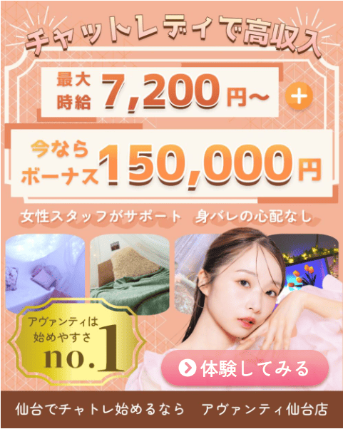 アヴァンティ仙台店![]() | 7,200円 | 仙台駅から徒歩1分 | 可能 | 交通費支給あり | ・入店最大10万円 ・出勤日数・配信時間に応じたボーナス ・美容ボーナス ・季節イベントボーナス |