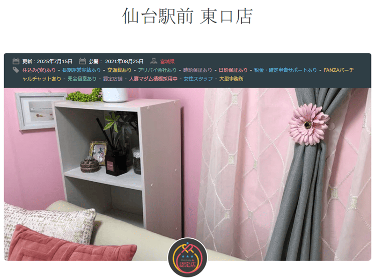アリス仙台駅東口本店![]() | 時給5,000円以上可 | 仙台駅東口から徒歩2分 | 可能 | 深夜帯~早朝など交通機関が使えない時間帯は補助 | 高額なボーナス制度あり |