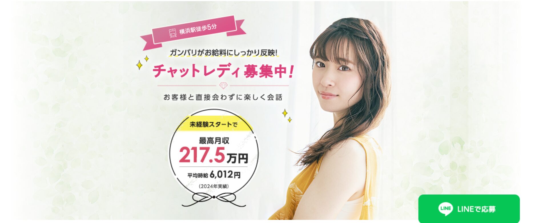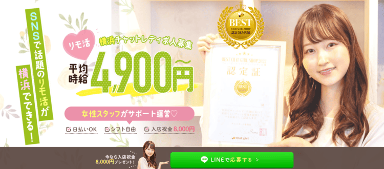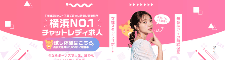 | フレイバーチャット | 6,750円 | 横浜駅より徒歩3分 | 可能 | 面接交通費の支給 | 各種ボーナスあり |