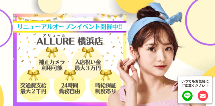 | アリュール | 1,500~3,500円 | JR横浜駅西口徒歩5分 | 可能 | 面接時最大2,000円まで全額支給 | ・入店お祝い金最大3万円 |
